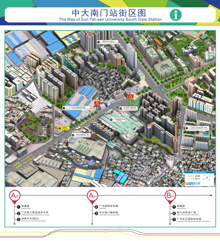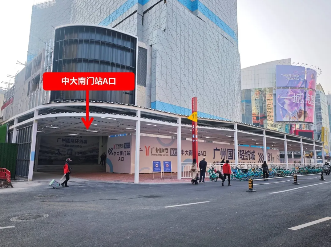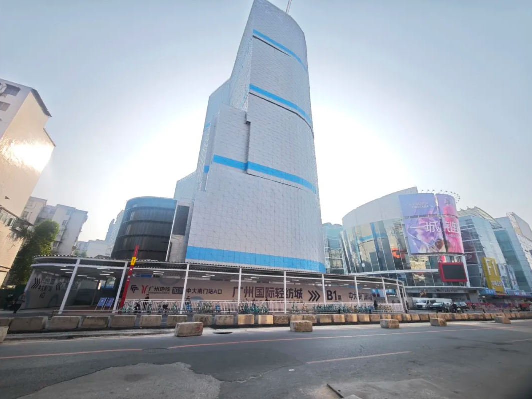 10号线中大南门站出站口即为广州国际轻纺城。站点位于海珠区瑞康路与金纺路交叉口,邻近中山大学广州校区南门,辐射整个中大纺织商圈。