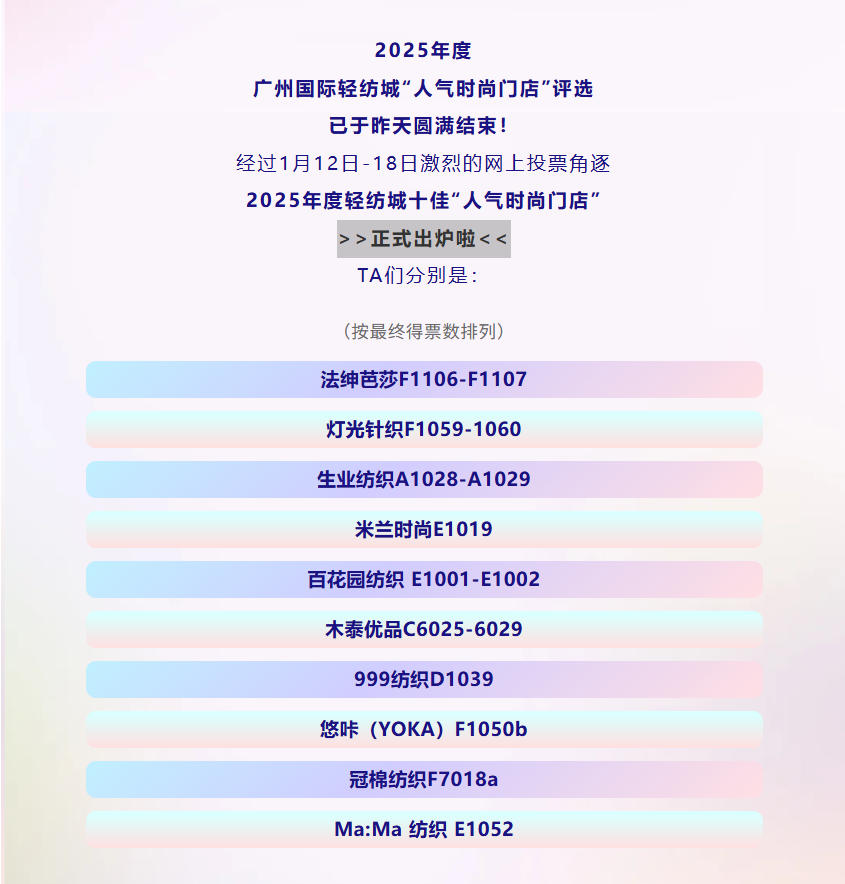 2025年度轻纺城十佳“人气时尚门店”正式出炉